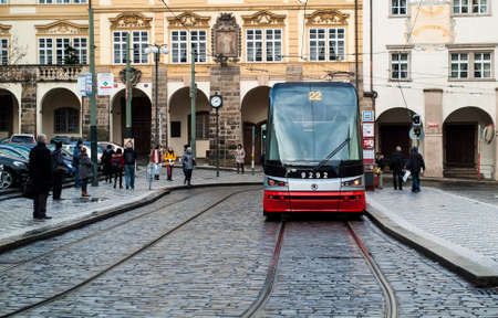 PRAGUE, CZECH REPUBLIC - OCTOBER, 2019: Red tram on the old streets of Prague