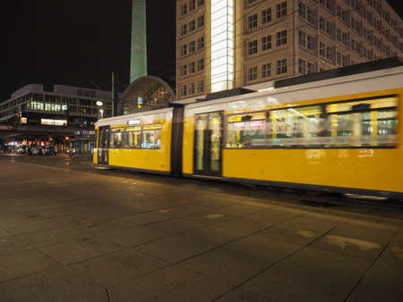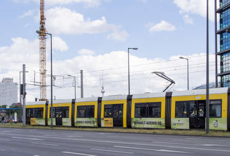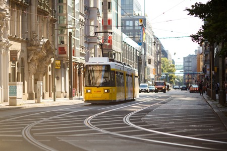 Berlin, Germany - June 26, 2016: Yellow tram in Berlin Mitte, Germany. Tramway public transport