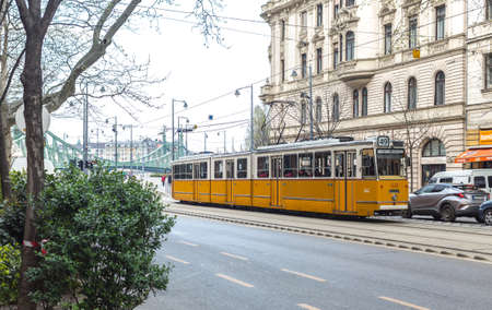 Budapest Hungary july 11, 2020 View of a traditional Hungarian electric tram for passengers driving through the streets and part of the public transport system of Budapest, the capital of Hungary