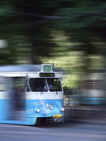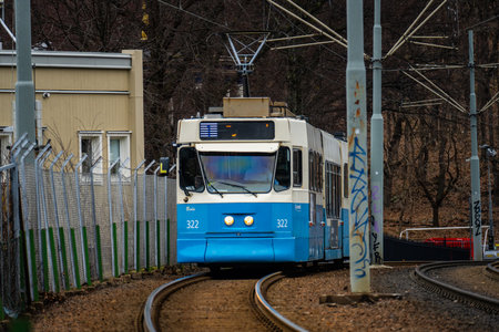 Gothenburg, Sweden - February 24 2024: Blue and white tram on a separated track