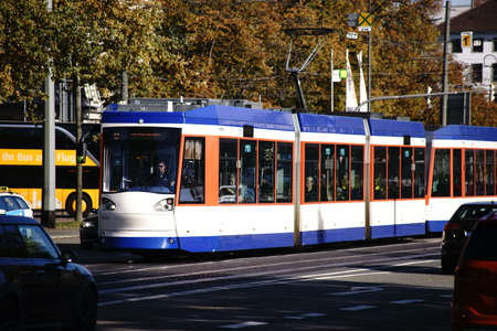 high-speed tram on the city street. Modern Tram In Dusseldorf, Germany October 20, 2018. Tram inside view, passenger compartment with passengers during a ride in Germany.