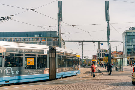 ROSTOCK, GERMANY - MAY 12, 2016: Rostocker Strassenbahn AG - RSAG - is the transport company in the city of Rostock and operates 6 tram and 22 bus lines.