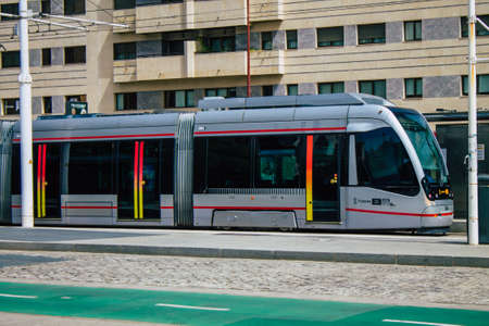 Tram running at full speed in the city of Bilbao, Spain