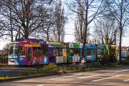 Colorful streetcar fully covered with commercial ads in Heidelberg, Germany.