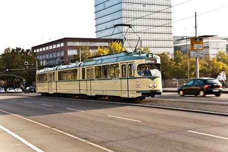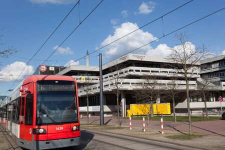 Dusseldorf, Germany - June 29, 2013: Modern tram on the Helmholtz street. The tramway network is operated by Rheinbahn AG and has eleven tram lines ran over 78.0 kilometres of route