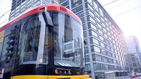 Warsaw, Poland. 10 January 2020. Tram in Polish capital Warsaw on Prosta street.