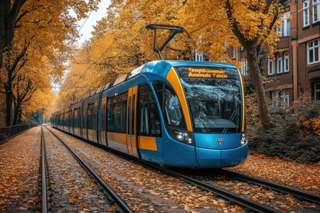 Fallen leaves landscape of tram on Chuncheng Street, Changchun, China