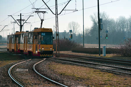 Warsaw. Poland. 03.22.2022. Yellow tram at the fork in the tracks.