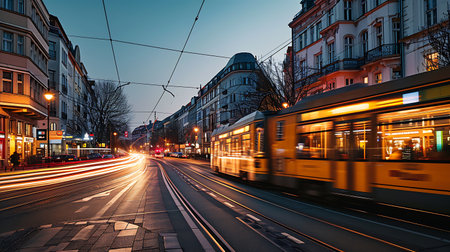 Public transportation at night. Lights of the tram in motion. Prague, Czech Republic