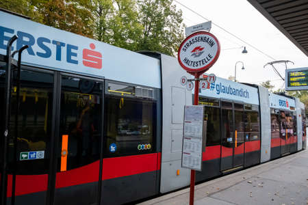 Vienna, Austria - October 10, 2019: View of electric tram coming to the station in Vienna, Austria.