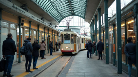Diverse commuters patiently waiting for a vintage tram at a covered urban station platform