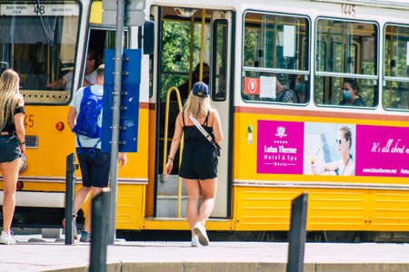 Budapest Hungary july 11, 2020 View of unidentified people taking the electric tram, part of the public transport system of Budapest, the capital of Hungary