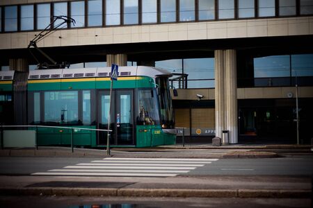 Helsinki, Finland - October 5, 2019: green tram transporting people in the central part of the Helsinki city, Finland