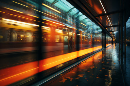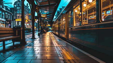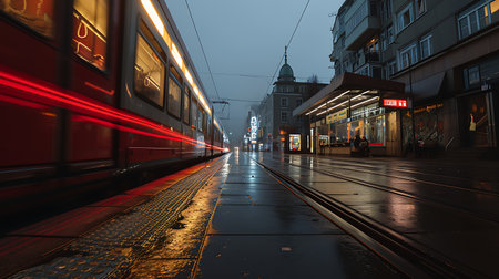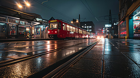 Tram arriving at a city station in the evening, reflecting sunset light on wet tracks for a serene scene. Generative AI