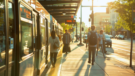 tram stop in bustling city, with view of towering buildings and busy street, created with generative ai