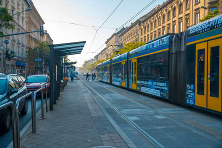 Budapest Hungary july 20, 2020 View of a new Hungarian electric tram for passengers driving through the streets and part of the public transport system of Budapest, the capital of Hungary