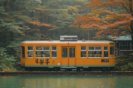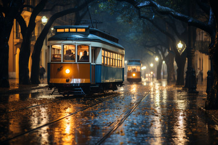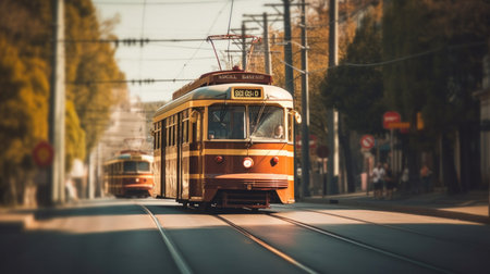 Historical tram crossing old neighborhood: nostalgic charm in motion., generative AI