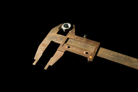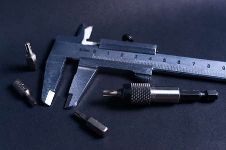 Caliper measurement in the workshop. Checking dimensions of made items. Dark background.