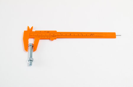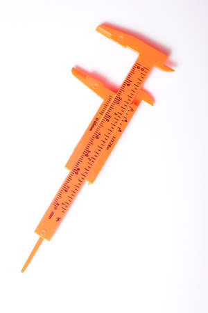 Orange vernier caliper plastic, vernier caliper is a measuring instrument used to precisely measure linear dimensions on white background