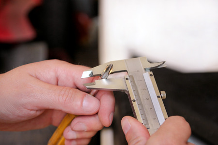 Vernier caliper in action to measure a diameter of head of knot screw. All are done on the white table
