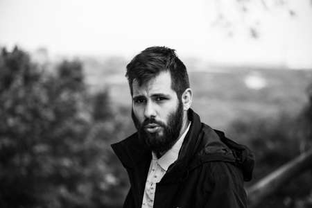 Face of serious bearded caucasian armenian young man looking at camera. Attractive guy stand on street city lifestyle. People. Beauty. Stand outdoors