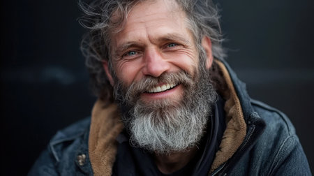 A man with a beard and a black jacket is smiling. He looks happy and content. Concept of warmth and friendliness