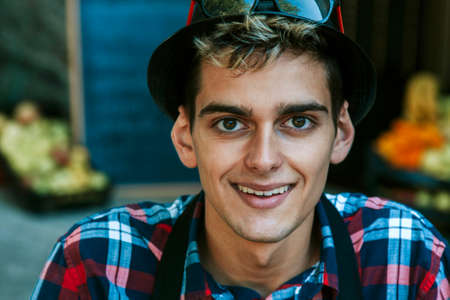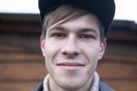 a guy in a cap 21-23 years old model looks smiling at the camera, portrait closeup.