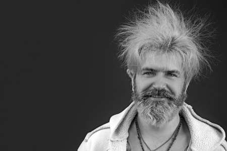 Goofy young man, with full beard and moustache and wild hair, pull a comical face to the camera. Space for your text.