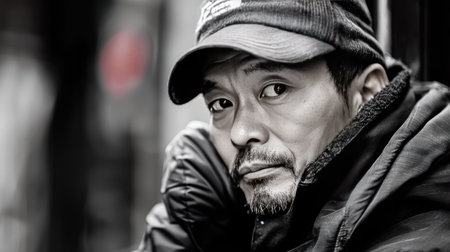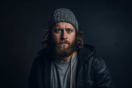 A man with a beard and a cap looks directly at the viewer with an intense and thoughtful expression, dressed in a warm jacket.