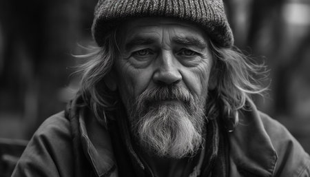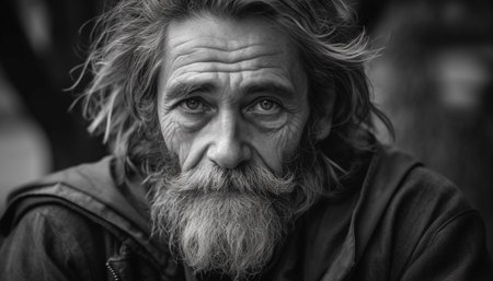 Gray haired senior man with beard looking serious in black and white portrait generated by artificial intelligence