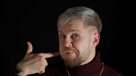Happy stylish young man with blue eyes in trendy clothes smiling excitedly, fooling and pointing to camera, beauty choosing lucky winner, gun gesture, indicating to awesome you on black background
