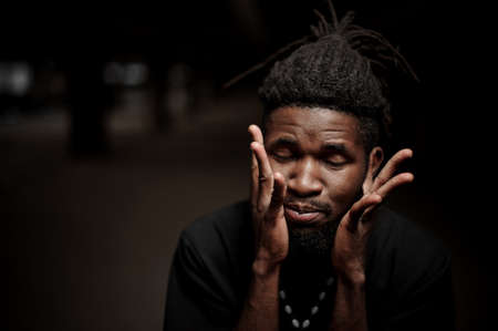 Close up portrait of the afro american guy with hands near his face on the dark background