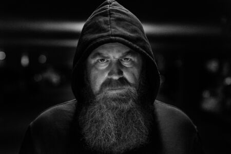 Dark shadowy portrait of a bearded man wearing a hooded top staring intently at the camera with a focused determined expression
