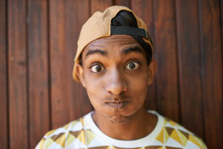 Never be too serious. Portrait of a teenage boy making a face while standing against a wooden wall.