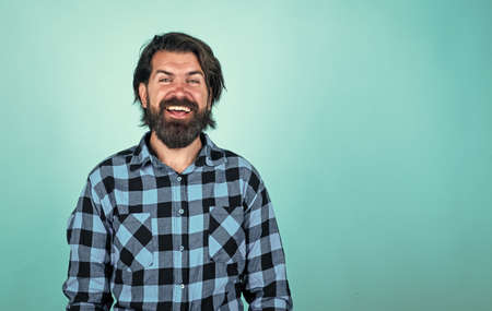 mature barber on blue background. masculinity and charisma. casual fashion style. modern looking bearded hipster. hairdresser concept. brutal handsome man with moustache. place for copy space