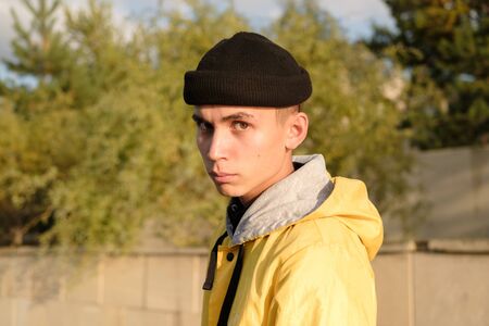 portrait of a young man. modern teenager in a black hat and a yellow raincoat. close-up