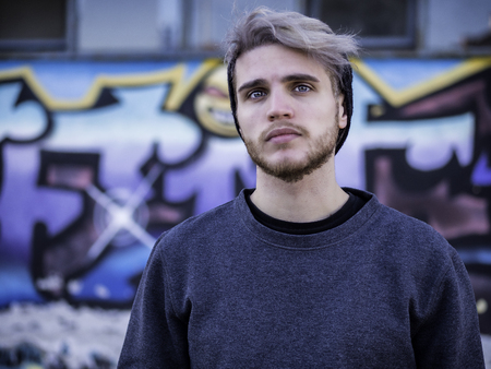handsome man in fashion clothes posing to the camera. hip hop lovers, street art concept.