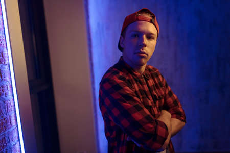 Handsome hipster in shirt posing to the camera with crossed arms.