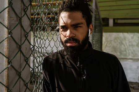 Young attractive black man sitting on the playground and observing. Horizontal.