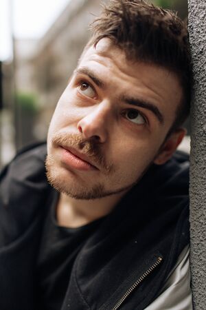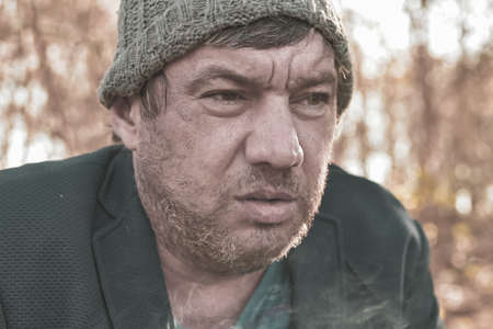 Portrait of homeless poor man with alcoholic bearded face looking at camera standing outdoors