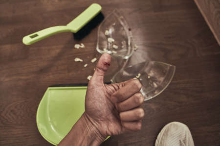 Close-up of a cut female finger on the background of a split cup and a brush with a dustpan for cleaning. A wound with blood received when cleaning broken dishes. High quality photo