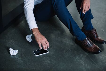 cropped view of businessman sitting on floor near smartphone with blank screen