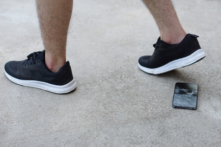 Closeup man wears black sport shoes, walking and his smartphone fell and broke on ground. Concept, damage with things in daily life from accident or careless. Mobile phone warranty