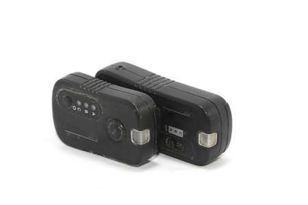 Close-up of the black camera flash trigger. Dusty and Old on white background