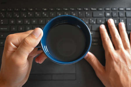 An overhead closeup shot of a businessman in formal attire holding a mug and typing on a computer keyboard