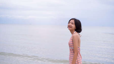 Portrait of happy Asian woman wearing a straw hat and a striped dress is smiling at the camera on a beach. Scene is cheerful and relaxed, as the woman is enjoying her time at the beach