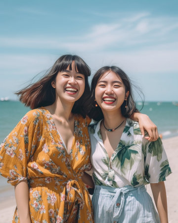 group of happy asian women in sunglasses having fun on the beach, Generative AI