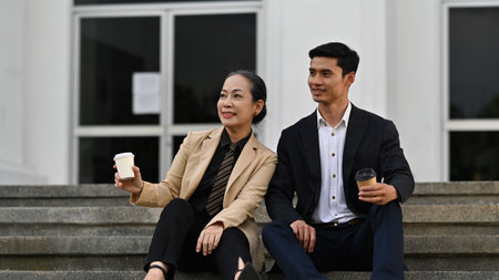 A Senior businesswoman and a businessman sit on steps, holding cups of coffee. talking after work