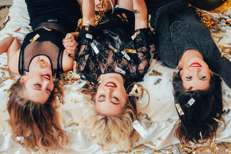 Women hangout joy. Great time together. Elated young females lying on bed upside down. Bachelorette party. Confetti fun.