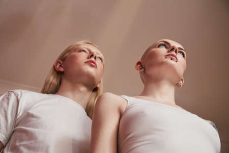 Womanly albino man with long blonde hair posing nearby bald masculine female